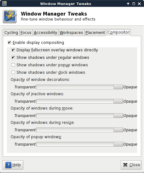 Created attachment 5019 compositing setup Attached file is a screenshot of my compositing setup. I'm using Xfce 4.10 (xfwm4 4.10.0-r1) on Gentoo amd64 multilib, with a GeForce GTX 560 and nvidia drivers 313.30.