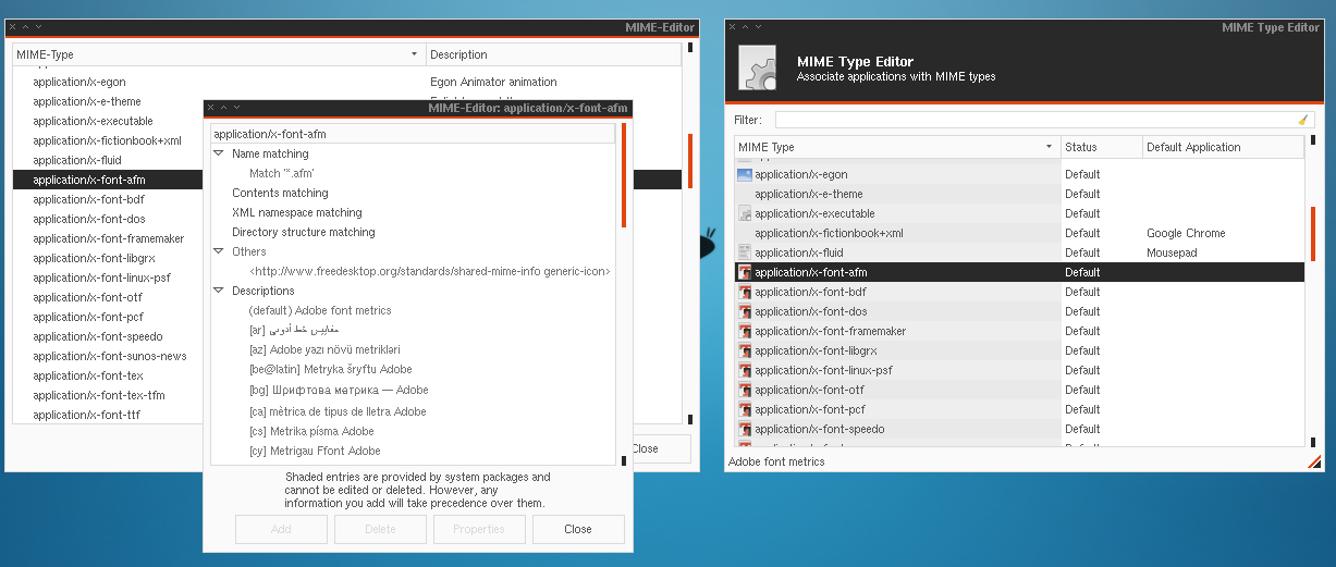 Created attachment 5048 ROX MIME-Editor vs. Xfce MIME Editor It would be nice if it would display more information about the selected mimetype eg. the pattern A tool that does it better (see screenshot) : http://rox.sourceforge.net/desktop/MIME-Editor