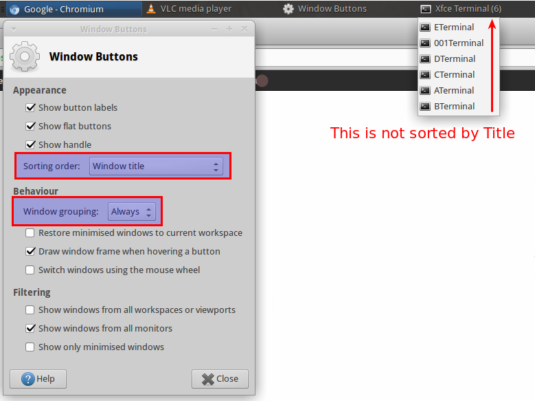 Created attachment 5072 Grouped items are not sorted by title I'm using xfce 4.10.0 with ubuntu 13.04 (xfce4-panel 4.10.0) On my xfce4-panel I use "Window buttons" with * sorting order : Window title * window grouping : Always Not grouped windows are correctly sorted by title, but grouped windows are not. Please take a look at the atteched files Best regards, Adrien