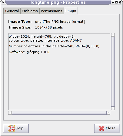 In a similar vein to displaying EXIF data for JPEGs, display data from PNG chunks for PNG image files. Various chunk types are listed in the PNG specification here: http://www.libpng.org/pub/png/spec/register/pngreg-1.3.0-pdg.html In particular, display the tEXt and zTXt chunks in a suitable property page. I'd have a go myself at this, but not being familiar with GTK nor XFCE programming it would take me longer than an expert. If someone were to give some hints, I'd be grateful. (Downloaded the GIT repository for XFCE, built it, no further yet.)