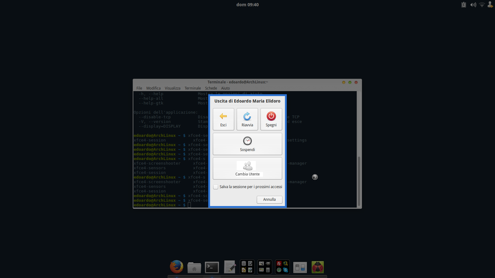 $ grep -R 'org.freedesktop.DisplayManager.Seat\|SwitchToGreeter' light-locker-1.7.0/src/gs-bus.h:#define DM_SEAT_INTERFACE "org.freedesktop.DisplayManager.Seat" light-locker-1.7.0/src/gs-listener-dbus.c: "SwitchToGreeter"); lightdm-1.18.0/NEWS: - Rename ShowGreeter() to SwitchToGreeter() lightdm-1.18.0/data/org.freedesktop.DisplayManager.conf: <allow send_destination="org.freedesktop.DisplayManager" send_interface="org.freedesktop.DisplayManager.Seat"/> lightdm-1.18.0/src/display-manager.xml: <method name="SwitchToGreeter"/> lightdm-1.18.0/src/dm-tool.c: "org.freedesktop.DisplayManager.Seat", lightdm-1.18.0/src/dm-tool.c: "SwitchToGreeter", lightdm-1.18.0/src/dm-tool.c: "org.freedesktop.DisplayManager.Seat", lightdm-1.18.0/src/lightdm.c: if (g_strcmp0 (method_name, "SwitchToGreeter") == 0) lightdm-1.18.0/src/lightdm.c: emit_object_value_changed (bus, seat_entry->path, "org.freedesktop.DisplayManager.Seat", "Sessions", get_session_list (session_entry->seat_path)); lightdm-1.18.0/src/lightdm.c: emit_object_value_changed (bus, seat_path, "org.freedesktop.DisplayManager.Seat", "Sessions", get_session_list (seat_path)); lightdm-1.18.0/src/lightdm.c: path = g_strdup_printf ("/org/freedesktop/DisplayManager/Seat%d", seat_index); lightdm-1.18.0/src/lightdm.c: " <interface name='org.freedesktop.DisplayManager.Seat'>" lightdm-1.18.0/src/lightdm.c: " <method name='SwitchToGreeter'/>" lightdm-1.18.0/help/C/user-switching.page:SwitchToGreeter - A greeter session is started. This allows the user to authenticate for a new session or authenticate to return to their current session. xfce4-session-43e532f/xfce4-session/xfsm-shutdown.c: const gchar *DBUS_INTERFACE = "org.freedesktop.DisplayManager.Seat"; xfce4-session-43e532f/xfce4-session/xfsm-shutdown.c: const gchar *DBUS_OBJECT_PATH = "/org/freedesktop/DisplayManager/Seat0"; xfce4-session-43e532f/xfce4-session/xfsm-shutdown.c: "SwitchToGreeter", xfce4-session-43e532f/xfce4-session/xfsm-shutdown.c: const gchar *DBUS_INTERFACE = "org.freedesktop.DisplayManager.Seat"; $ ps ax | grep '[x]fce4-session\|[l]ight\|[d]bus' 876 ? Ss 0:00 /usr/bin/dbus-daemon --system --address=systemd: --nofork --nopidfile --systemd-activation 1208 ? Ssl 0:00 /usr/sbin/lightdm 1214 tty1 Ssl+ 0:01 /usr/libexec/Xorg :0 -seat seat0 -auth /var/run/lightdm/root/:0 -nolisten tcp vt1 -novtswitch 1273 ? Sl 0:00 lightdm --session-child 12 19 1309 ? Ss 0:00 /usr/bin/dbus-daemon --session --address=systemd: --nofork --nopidfile --systemd-activation 1338 ? Sl 0:00 xfce4-session 1344 ? S 0:00 /bin/dbus-daemon --config-file=/usr/share/defaults/at-spi2/accessibility.conf --nofork --print-address 3 1403 ? Sl 0:00 light-locker Everything is there but "Switch User" button, within logout dialog, does not "Switch User", effect is same as with "Log Out" button.