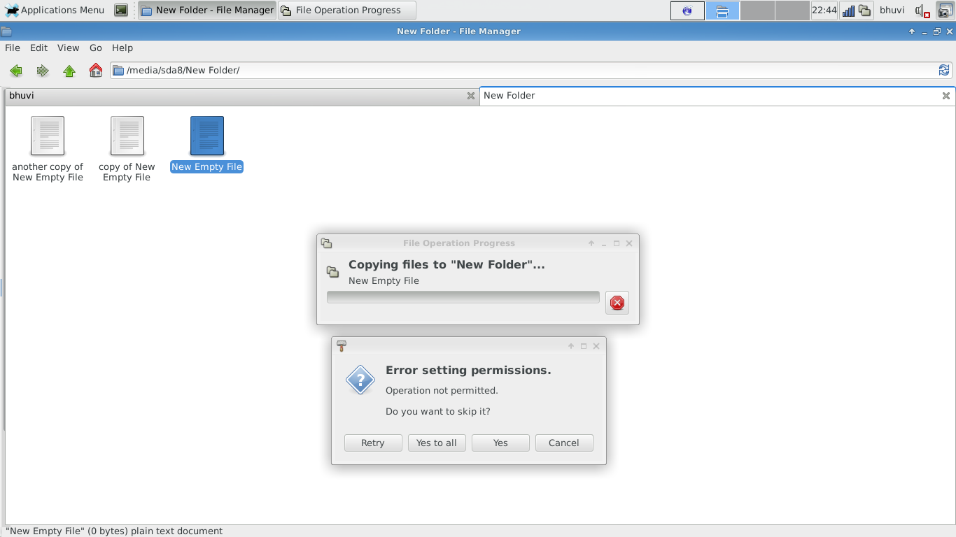 Created attachment 5239 screenshot of the bug. Note : New folder in the screenshot is in an ntfs volume When copying a file to a ntfs formatted volume thunar displays an error message "Error setting permissions.". This message is always shown irrespective of the source file location i.e it is in a ntfs partition or ext4 partition. But the file is being copied successfully. Only that the error message is displayed when it is not an error. Attached a scrrenshot of the bug.