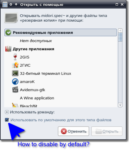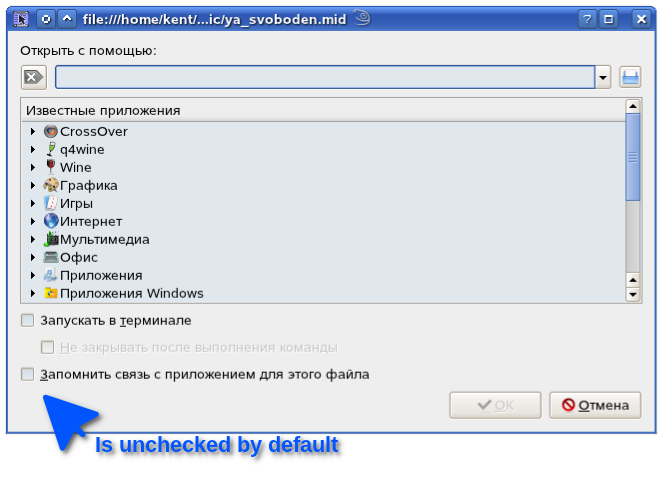 Created attachment 5262 "Open with…" dialog Change the default behavior for unknown files in "Open with…" dialog. I open an unknown file and see a dialog to choose an application. Probably, I don't want to use the same app for a next file. But the checkbox is always checked. See the attachment. As far as I know, in KDE the opened file will never be associated with the application you open it with. The same is in MS Windows. It would be good to have the checkbox inactive or add a setting in Thunar allowing people to have their preferred behavior be remembered.