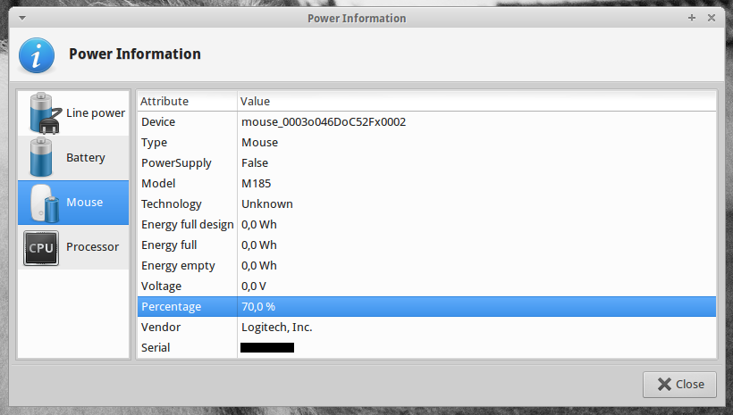 Created attachment 5275 Display Power Percentage Here's patch that displays the percentage, which works for my Logitech M185 Unifying wireless mouse.