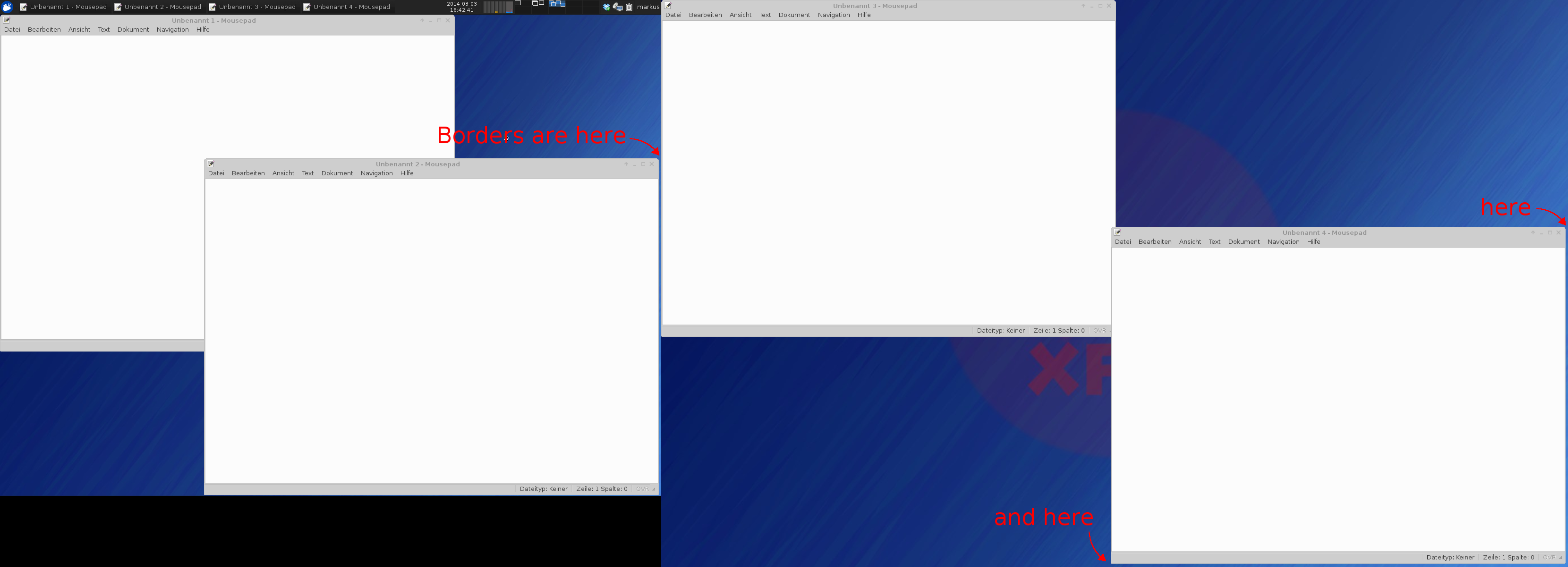 Created attachment 5377 Screenshot enforced borders This is a screenshot of 4 application windows that have been auto-positioned by the window manager. While editing the screenshot, I noticed an additional border at the bottom of the right screen. If I remove the right screen, the left one will still look the same as in this screenshot.