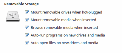 Created attachment 5355 Thunar Volman settings are correct I have a 1TB removable USB drive which is not mounted automatically with thunar-volman. All other removable drives are automatically mounted. Is it possible that thunar-volman recognises large removable drives as internal drives? It cannot be a problem of the drive itself since udevil/devmon automounts it fine. thunar-volman 0.8.0-1 thunar 1.6.3-1 gvfs 1.18.3-3 gvfs-afc 1.18.3-3 udisks2 2.1.1-3 Specs of the removable drive: /dev/sdb: ATA device, with non-removable media Model Number: WDC WD10EAVS-00D7B0 Serial Number: WD-WCAU41164381 Firmware Revision: 01.01A01 Transport: Serial, SATA 1.0a, SATA II Extensions, SATA Rev 2.5 Standards: Supported: 8 7 6 5 Likely used: 8 Configuration: Logical max current cylinders 16383 16383 heads 16 16 sectors/track 63 63 -- CHS current addressable sectors: 16514064 LBA user addressable sectors: 268435455 LBA48 user addressable sectors: 1953525168 Logical/Physical Sector size: 512 bytes device size with M = 1024*1024: 953869 MBytes device size with M = 1000*1000: 1000204 MBytes (1000 GB) cache/buffer size = 8192 KBytes Capabilities: LBA, IORDY(can be disabled) Queue depth: 32 Standby timer values: spec'd by Standard, with device specific minimum R/W multiple sector transfer: Max = 16 Current = 0 Recommended acoustic management value: 128, current value: 254 DMA: mdma0 mdma1 mdma2 udma0 udma1 udma2 udma3 udma4 udma5 *udma6 Cycle time: min=120ns recommended=120ns PIO: pio0 pio1 pio2 pio3 pio4 Cycle time: no flow control=120ns IORDY flow control=120ns Commands/features: Enabled Supported: * SMART feature set Security Mode feature set * Power Management feature set * Write cache * Look-ahead * Host Protected Area feature set * WRITE_BUFFER command * READ_BUFFER command * NOP cmd * DOWNLOAD_MICROCODE Power-Up In Standby feature set * SET_FEATURES required to spinup after power up SET_MAX security extension * Automatic Acoustic Management feature set * 48-bit Address feature set * Device Configuration Overlay feature set * Mandatory FLUSH_CACHE * FLUSH_CACHE_EXT * SMART error logging * SMART self-test * General Purpose Logging feature set * 64-bit World wide name * Segmented DOWNLOAD_MICROCODE * Gen1 signaling speed (1.5Gb/s) * Gen2 signaling speed (3.0Gb/s) * Native Command Queueing (NCQ) * Host-initiated interface power management * Phy event counters DMA Setup Auto-Activate optimization * Software settings preservation * SMART Command Transport (SCT) feature set * SCT Read/Write Long (AC1), obsolete * SCT Write Same (AC2) * SCT Error Recovery Control (AC3) * SCT Features Control (AC4) * SCT Data Tables (AC5) unknown 206[12] (vendor specific) unknown 206[13] (vendor specific) Security: Master password revision code = 65534 supported not enabled not locked not frozen not expired: security count supported: enhanced erase 232min for SECURITY ERASE UNIT. 232min for ENHANCED SECURITY ERASE UNIT. Logical Unit WWN Device Identifier: 50014ee257199a8f NAA : 5 IEEE OUI : 0014ee Unique ID : 257199a8f Checksum: correct