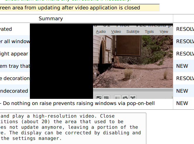 Created attachment 5427 xfwm4 video overlay issue after closing video player Open a video player application and play a high-resolution video. Close application. After several repetitions (about 20) the area that used to be occupied by the overlay video does not update anymore, leaving a portion of the display unusable and unresponsive. The display can be corrected by disabling and re-enabling compositing through the settings manager. Reproducible in Fedora 20 Xfce fresh install and fully updated install with VLC and other media players, both in i386 and x86_64 environments, with compositing enabled. Easier to reproduce with more processor-intensive videos, but the problem is reproducible with any video. Video hardware: agpgart-intel, Intel 945GM Chipset, gtt size: 262144K total, 262144K mappable, 16384K stolen memory, AGP aperture is 256M @ 0x60000000. fbcon: inteldrmfb (fb0) is primary device. fb0: inteldrmfb frame buffer device. Example attached - overlay of the remains of the video player - cannot be removed until the compositor is disabled.