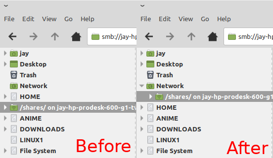 Then it should be like this: Network jay-hp-prodesk-600-g1-twr.local /shares/ Anyways, the code to prevent mixing of network folders together with other devices can be found here: https://bugzilla.xfce.org/show_bug.cgi?id=16471#c10