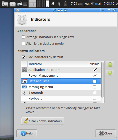 Oh thanks. I missed that note about restarting. And other edition are not subject to restart… I mean add/remove item to the panel. Could it be a restart button instead of a note? I suppose it cant, because the popup is probably a child of the panel… Do you know why the network-manager and those apps (battery, sounds…) are now handled by the indicator?