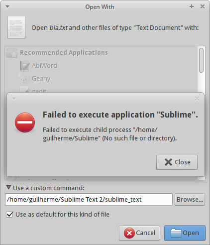 Created attachment 5486 Use case in action. When trying to open a file with a custom command, the file selector for the desired executable doesn't escape the full path before setting the text widget's value, which in cases where the path contains spaces (for example) leads to a "Failed to execute application" error.