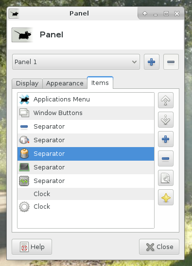 Created attachment 5494 Panel Items List The list of items in on the Items tab in the Panel Settings dialogue is inaccurate. Contains duplicate names along side different icons. Eg. "Clock" beside Whisker Menu icon. Also the name will change when hovering with the mouse pointer. Please see attachment image.