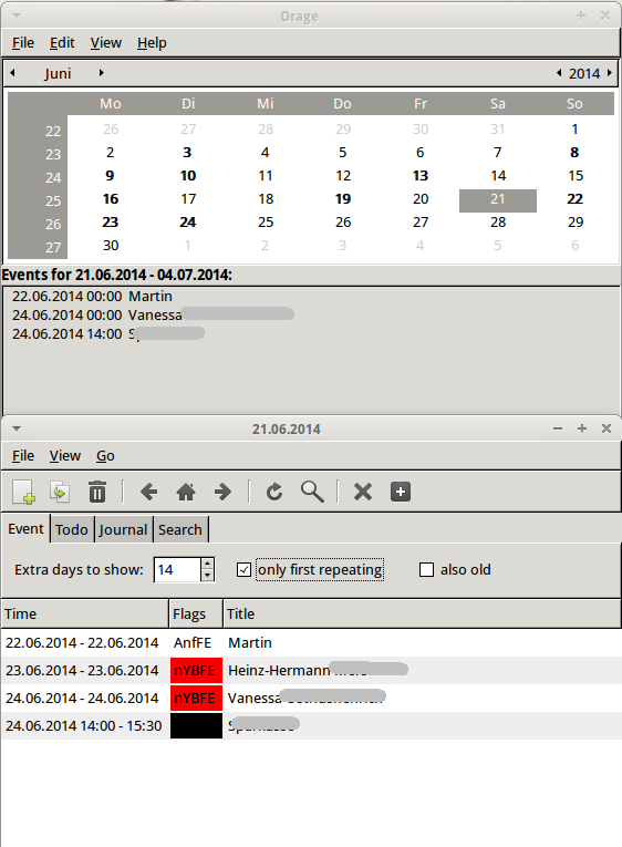 Created attachment 5530 Screenshot Anybody working on this? No? This bug can not be as big! As you can see, the reminder at 23 June is not displayed in the main events list. But selecting the "extended" event list and having marked "only first repeating" then the reminder is there! (Without "only first repeating" this won't work). Well, I am rather going to change my calendar program than changing my database.