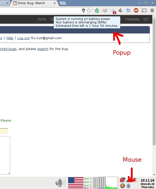 Created attachment 5499 popup in the wrong place When I hover my mouse cursor over certain items in systray (e.g. xfce4-power-manager, SELinux tool), a popup appears at the top of the screen, but the systray is at the bottom of the screen.