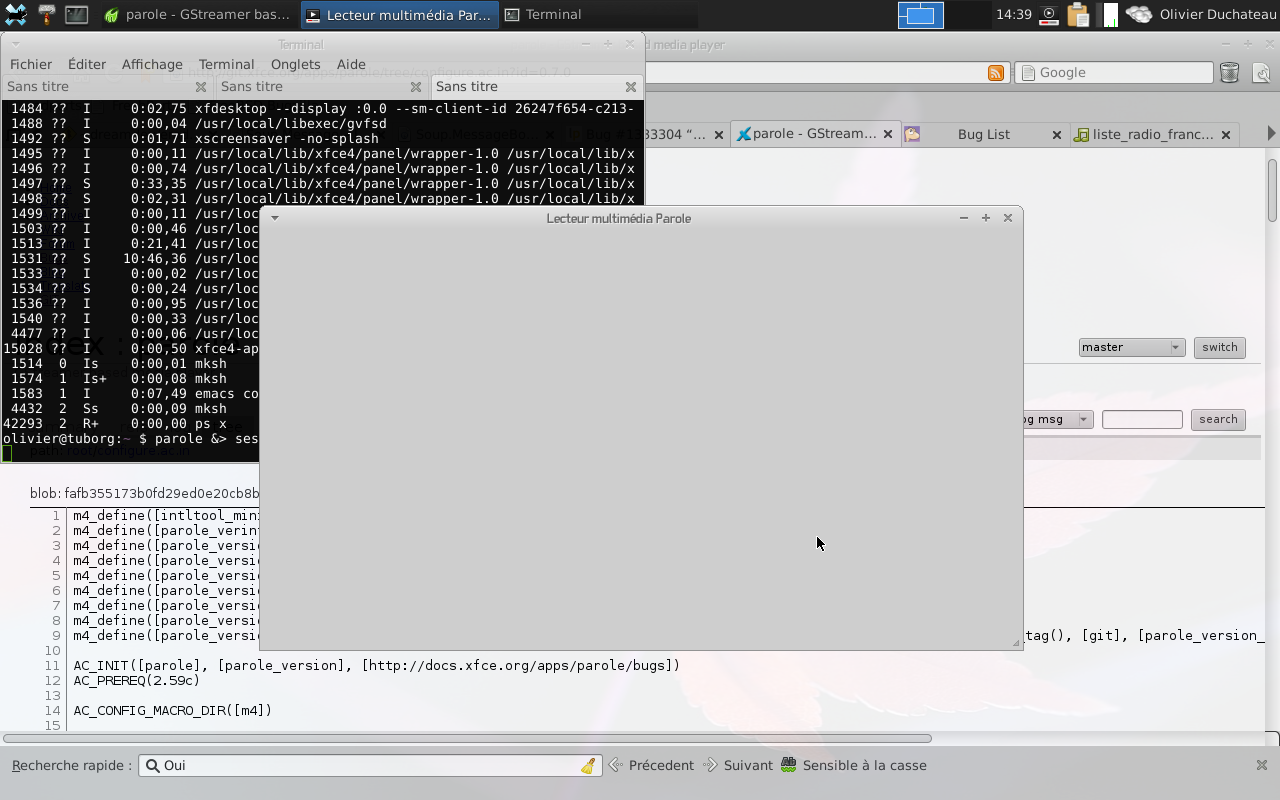 I forget to mention (excerpt from build log) checking for glib-2.0 >= 2.32.0... 2.36.3 checking for gobject-2.0 >= 2.32.0... 2.36.3 checking for dbus-1 >= 0.60... 1.6.12 checking for libxfce4util-1.0 >= 4.10.0... 4.11.0 checking for libxfconf-0 >= 4.10.0... 4.10.0 checking for libxfce4ui-2 >= 4.11.0... 4.11.1 checking for gtk+-3.0 >= 3.2.0... 3.8.2 checking for gstreamer-1.0 >= 1.0.0... 1.2.4 checking for gstreamer-base-1.0 >= 1.0.0... 1.2.4 ------------------------------------------------------ Parole Media Player 0.7.0 ==================================== Installation: ============= prefix: /usr/local pixmapsdir: /usr/local/share/pixmaps Debug: minimum Building plugin api docs: no GStreamer API version: 1.0 GTK+ version: GTK+-3 Optional dependencies: ====================== Clutter Backend: no Taglib: yes Plugins to build: ================= Notify: yes System Tray icon: yes MPRIS2: no