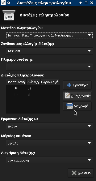 I am not sure I understood the question. Yes, I can select el from menu. Just for your information, in my system: grep 'el.*gr' /usr/share/X11/xkb/rules/base * el = pc+gr * el = pc+gr%(v[1])