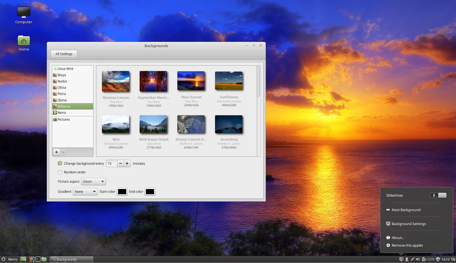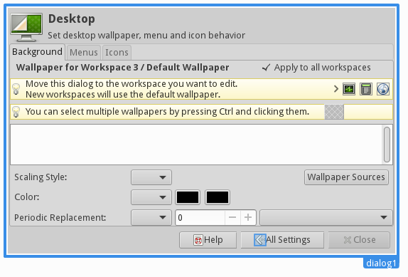 Created attachment 5763 Glade 2 file This report is against v 4.11/trunk. 1. Please make the window larger by default so more wallpapers are visible, and slightly reduce the spacing between wallpapers / increase their size so they can be seen a bit better 2. Please make it possible to view the contents of several folders at the same time so I can browse through two or three concurrent wallpaper folders. Maybe it'd be better to aggregate useful sources of wallpapers and have a single button on the main UI that goes to a "Wallpaper Sources" dialog? That dialog should have a list of used folders, and Add/Remove/Reset to default/Close buttons 3. Please load the "/usr/share/backgrounds" and "/usr/share/backgrounds/xfce" folders, as well as their .local/share counterparts by default to the wallpaper sources. 4. Remove the "None" style, replace it with two pixmaps automatically emulated into the wallpaper list: a "Color only" one and a "No wallpaper" one. Tooltips: "Lets you select a color or gradient to use as a wallpaper" and "Lets you use another program to set your wallpaper". Note the "No wallpaper" option doesn't appear to have many use cases, it should really appear last in the list. 5. If an image is selected, set "Style" to sensitive and "Color to insensitive". If a color is selected, reverse. Note it might look better to show/hide instead of setting to sensitive. I think both options are acceptable. 6. Rename "Wallpaper for my desktop" to "Default wallpaper"? and use that Default wallpaper for new workspaces? 7. Add the following text to the infobar when modifying workspaces one by one: "New workspaces will use <explain new workspace wallpaper logic here.>" 8. Make sure that the default style is well applied. Right now new workspaces default to "Stretch", they should default to the style of the default/global wallpaper. 9. Separate the options into more clearly spread out groups, to avoid confusions (e.g., Random and Apply to all workspaces seem linked) 10. Look up attached suggested design. Combo boxes fill as follows: Style [ same as now, except for none which is removed ], Color [ same as now ], Periodic Replacement [ Disabled (default), Next in Sources, Random in Sources, Next among selection, Random among selection ], every [ Seconds, Minutes, Hours, Days, Weeks, Months, At start up (clarify what chronologically is, if it's too unclear best to remove ] 11. Let people select multiple wallpapers. When single wallpaper, set the last selected one, when cycling through selected wallpapers, use that information. There used to be a hidden feature to display a list of wallpapers periodically, it's better to implement it this way so it's visible to users. When the periodic change is set to something with "Selection", display the Multiple Selection infobar. Cheers