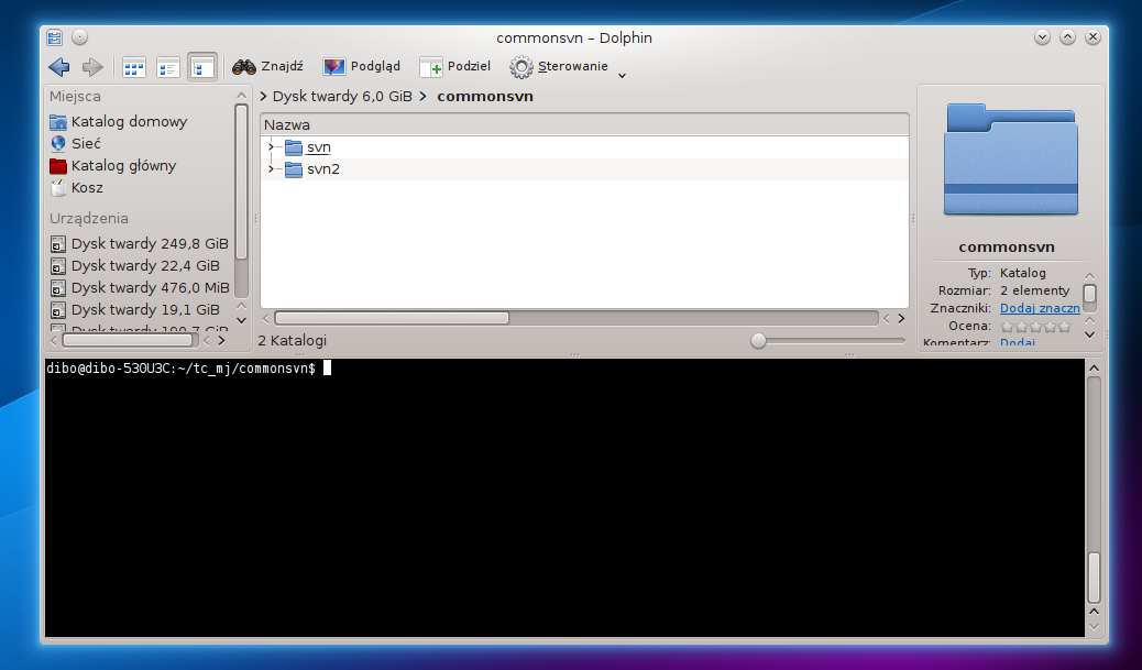 Created attachment 5765 After Hi, This is only suggestion for new feature. In Dolphin (KDE file browser) when you press F4, docked terminal is extending (at bottom) and pointing to the current dolphin path. Nautilus for ubuntu has similar extension but can't find anything for Thunar. Only way is to use right click and "Open in terminal" (or assign custom action). I know that it sounds like trivial and stupid extension but it is very handy when you work on many tree directories and want to quickly run a script / command like SVN. 1. Navigate in folders 2. F4 show terminal 3. Run script 4. F4 close terminal So comfortable :) . I attached screens how it's look like in dolphin Regards