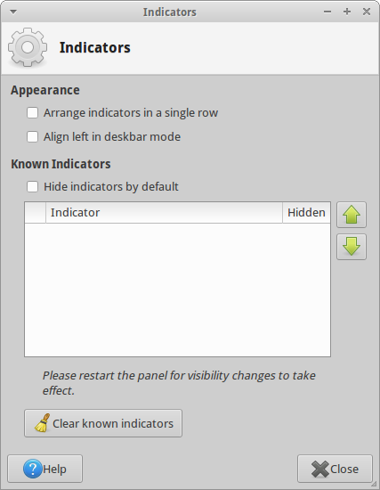 Created attachment 5843 Screenshot of the Indicators Properties window after 'Clear known indicators' has been clicked and the window has been closed then re-opened When I click the "Clear known indicators" button the the properties, all of the indicators are gone from the panel and the list on closing then re-opening the properties (see attachment). I have to remove then re-add the item to the panel to fix this, then re-configure my preferred visibility settings of each indicator.