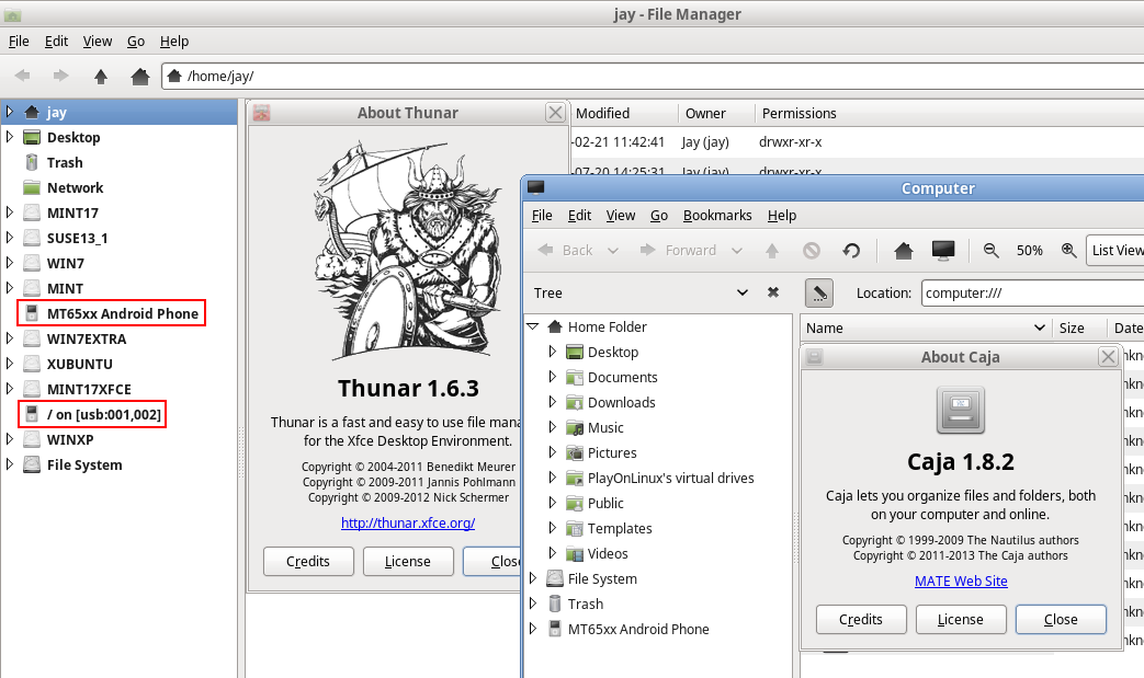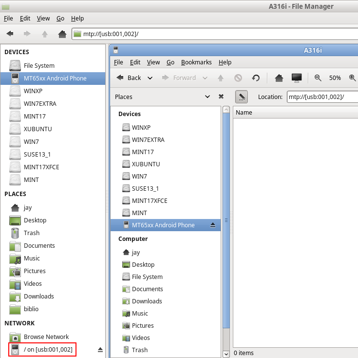 Created attachment 5986 thunar tree view vs caja tree view After plugging in my android phone into my laptop, i noticed that in tree view, thunar is listing two entries for the phone, and it also had two entries for the phone in shortcuts view, but placed the second one under the network section.