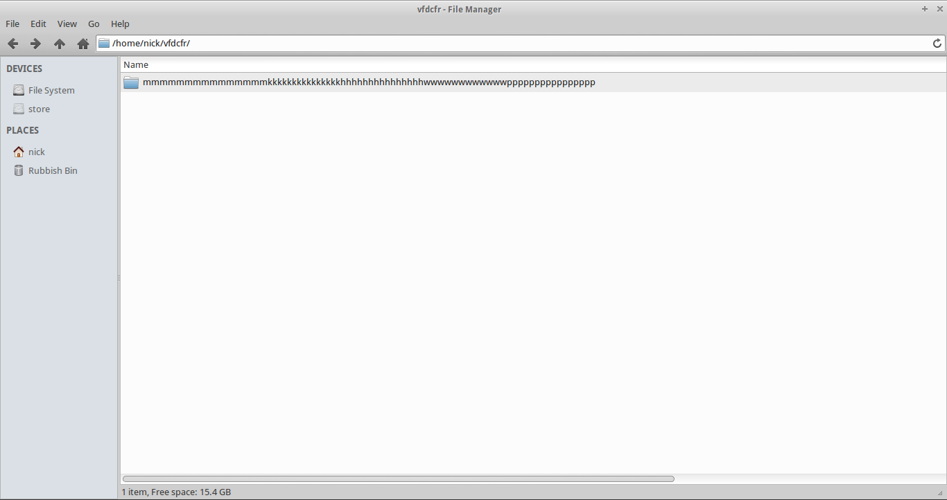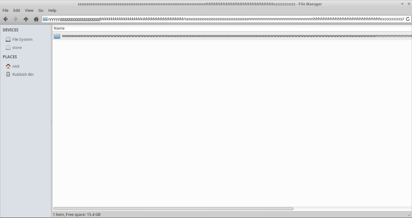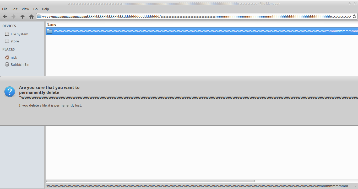Created attachment 6109 thunar1.png Thunar 1.6.3 in Xubuntu 14.10 I created some nested directories with long names to see how Thunar would handle them: $ mkdir -p vfdcfr/mmmmmmmmmmmmmmmkkkkkkkkkkkkkkkhhhhhhhhhhhhhhhwwwwwwwwwwwwpppppppppppppppp/ttttttttttttttttttttttttyyyyyyyyyyyyyyyyyyygggggggggggggggggggkkkkkkkkkkkkkkkkkkkkddddddddddddddddd/sssssssssssssssssssssssssssssssssssnnnnnnnnnnnnnnnnnnnnnnnnnnnhhhhhhhhhhhhhhhhhhhhhhhhhhhhcccccccccccc/wwwwwwwwwwwwwwwwwwwwwwwwwwwwwwwwwwwwwwwwwwwwwwwwwwwwwwwwwwwwwwwwwwwwwwwwwwwwwwwwwwwwwwwwwwwwwwwwwwwwwwwwmmmmmmmmmmmmmmmmmmmmmmmmmmmmmmmmmmmmmmmmmmmmmmmmmmmmmmmmmmmmmmmmmmmmmmmmmmmmmmmmmmmmmmmmmmmmmmmmmmmmmmm The following three screenshots show the results: 1 (thunar1.png): The whole filename is displayed, necessitating a horizontal scrollbar which hides all columns except for the first. Would it not be better to do what Midnight Commander does, i.e.: mmmmmmmmmmmmmmm~mmmmmmmmmmmmmm or mmmmmmmmmmmmmm...mmmmmmmmmmmmmm ? 2 (thunar2.png): If I try to delete something, the delete dialogue box goes off the screen, hiding the part of it where the buttons are. 3 (thunar3.png): Once a horizontal scrollbar appears, it remains there unnecessarily after navigating back (or forward) to a directory where it is not required, thus hiding the other columns.