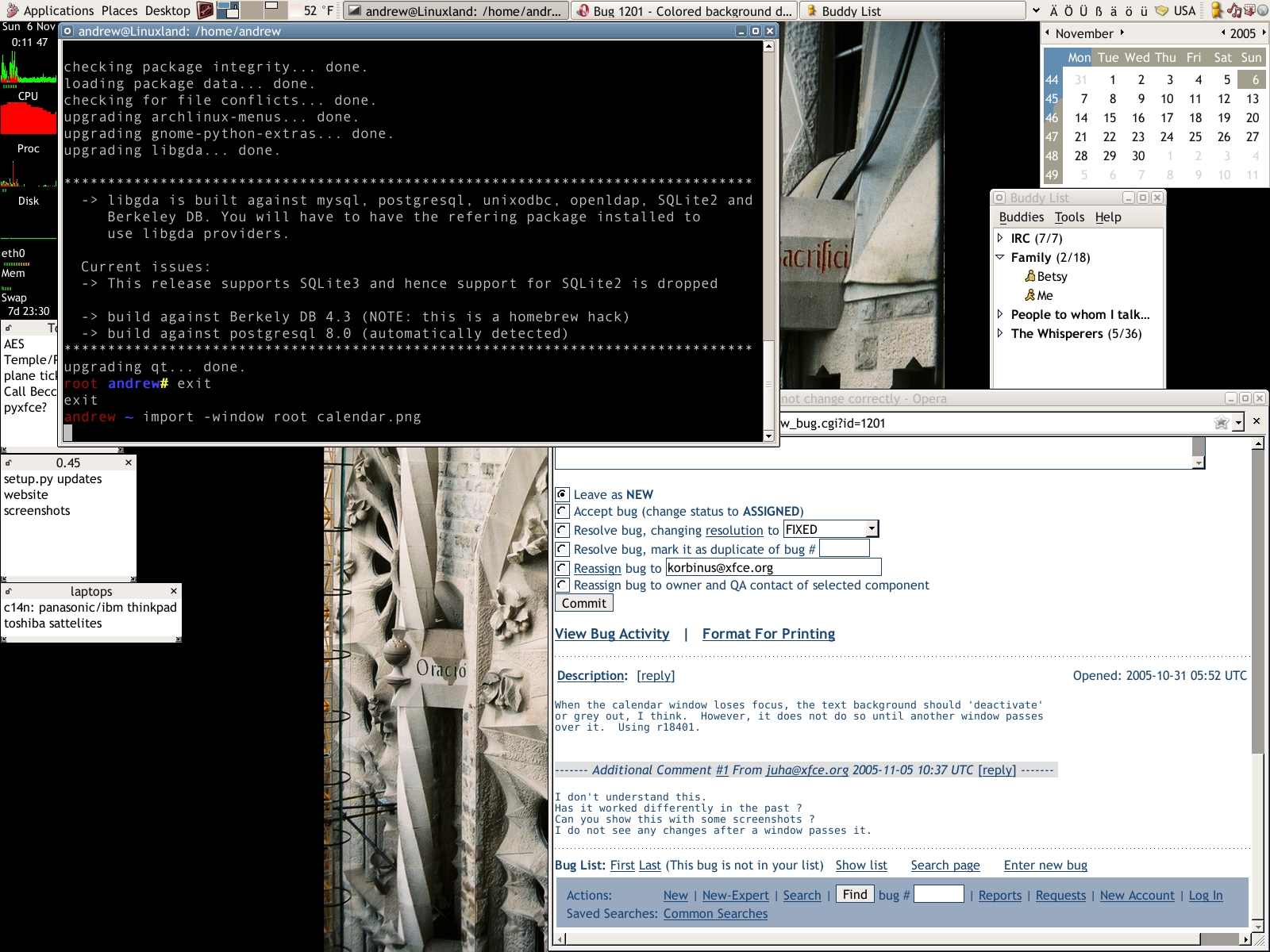 Created attachment 336 Screenshot demonstrating bug Here I clicked on the calendar to make it active, clicked on the Gaim icon to show it (it covered from Tuesday through Sunday on the calendar), and moved it down and to the left, over week numbers 46-49. Only when I pass over the blue background does it turn grey.