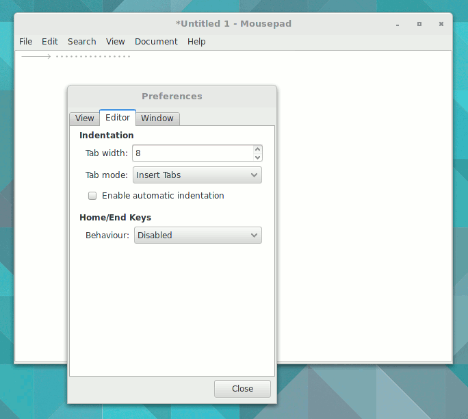 Created attachment 6451 Display whitespace is ON. 1 tab-tab, 1 spaces-tab, 1 failed-tab Location: Edit | Preferences | Editor | Tab mode: Summary: 1. "Tab mode" can't be switched back to "Insert Tabs" 2. "Tab mode" will always appear to be set to "Insert Tabs" Reproduction: 1. Change "Tab mode" to "Insert Spaces" 2. Go back and view the setting. It appears to be set to "Insert Tabs" 3. Press the Tab key in the file, it will create spaces. 4. Go back to the setting, and even though it already says "Insert Tabs", actually click "Insert Tabs" and press Close. 5. Press the Tab key in the file, it will still create spaces. Attempted Workaround: I uninstalled Mousepad, deleted ~/.config/Mousepad with its contents, rebooted, and re-installed Mousepad, but the settings are the same. I created a couple new users so I could test the bug a few more times. Environment: Mousepad in Cinnamon on Arch Linux. Packages: mousepad 0.4.0-1, cinnamon 2.6.13-3, linux 4.1.6-1