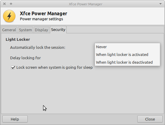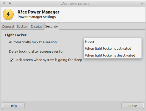 Created attachment 6477 screenshot Now that we're not actually using a screensaver, but light-locker so the screen can be set to blank, sleep or switch off, perhaps the label in the Auto lock session of the security tab could be reworded. Never When light locker is activated When light locker is deactivated (Managed to work out what to change and where locally to see how it would appear - see screenshot)
