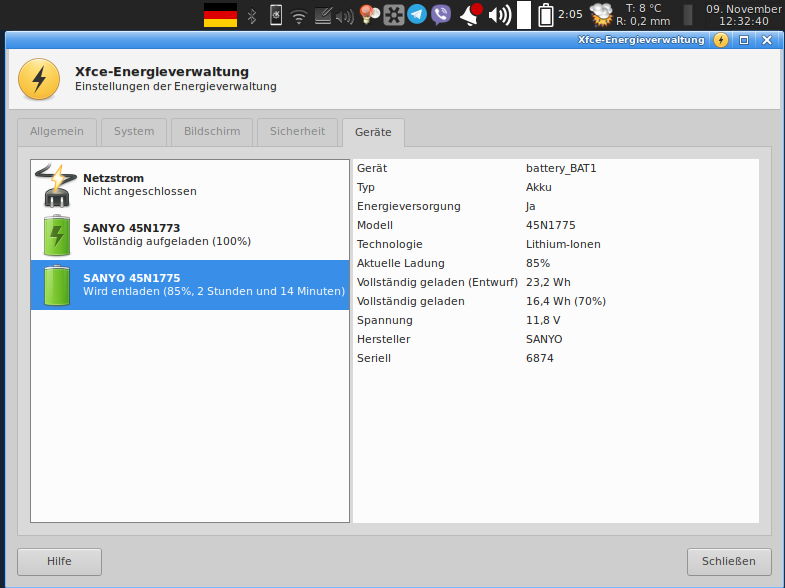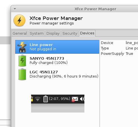 My Lenovo Thinkpad T450s has two batteries. Power-Manager's Panel shows remaining time and percentage. Percentage is correctly averaged, but remaining time should be adden (e.g. when one battery will last another 2h, and the other will last 1h, the result should be 3h), but it is not. It seems like it is averaged as well, resulting in 2h remaining, when one battery is 100% full and the other has 6h remaining. (this is my first bug report, so please tell me what more information you need, thanks)