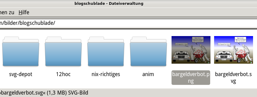 Created attachment 6602 inkonsistency between view and status bar Working with Inkscape, I often export an image, which is saved as xy.svg as xy.png to the same directory. Viewing it in Thunar, the thumbnail preview (didn't test for other views) shows the files in some order (by age, descending) and I mark the first one, which is displayed as xy.svg. However the status bar shows xy.png. Opening the details box, it is xy.png too. Doing something with the file, i.e. opening it with inkscape, which handles both formats opens the .png-file. Hitting the 'refresh' icon doesn't change the view, but leaving the directory and entering it again solves the problem. I marked this as a major issue, since you can delete serious amounts of work by accident that way. I add two screenshots as attachments, if that works. :) Ah, I see, only one attachment possible.