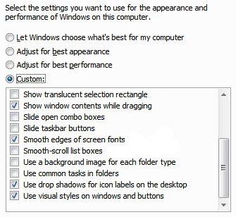 Created attachment 6610 the performance options dialog window from M. Windows XP I remember M. Windows XP which provided a dialog window for performance options. It allowed the end-user to tweak the look&feel experience from energy saving point of view (or cpu/memory usage point of view). When searching energy efficient desktop environnements, users can use alternative to XFCE (like LXDE, Razor-qt, just OpenBox, i3, ...). However those environments seem to offer stacking or tiling-only window managers which have some drawbacks (like energy consumption when painting unnecessary windows). This would allow XFCE to be installed on Netbooks.