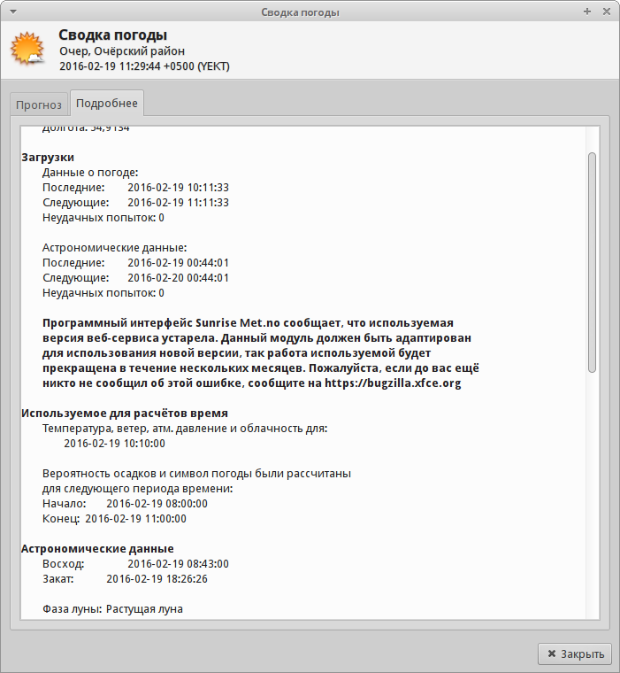 Created attachment 6617 вот еще Программный интерфейс Sunrise Met.no сообщает, что используемая версия веб-сервиса устарела. Данный модуль должен быть адаптирован для использования новой версии, так работа используемой будет прекращена в течение нескольких месяцев. Пожалуйста, если до вас ещё никто не сообщил об этой ошибке, сообщите на https://bugzilla.xfce.org Software interface Sunrise Met.no reports that used version of the web service is outdated. This module must be adapted to use the new version , so the work will be used It stopped for a few months . Please, if you still up Nobody has reported this error,