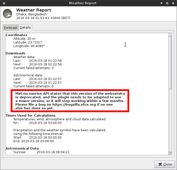 Created attachment 6631 warning about deprecated API Met.no sunrise API states that this version of the webservice is deprecated, and the plugin needs to be adapted to use a newer version, or it will stop working within a few months.Please file a bug on https://bugzilla.xfce.org if no one else has done so yet.