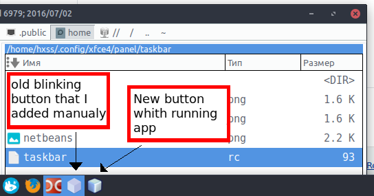 Created attachment 6788 screenshot Hello. I'm using archlinux 4.7.1-1 and xfce4(4.12.0) whith xfce4-taskbar-plugin(from aur 20130504-2). When I try to pin NetBeans at taskbar panel nothing happens. NetBeans.desktop file in menu running command 'netbeans %f'. When I added this command to taskbar.rc and clicked on NetBeans button - they started whith new button on taskbar and old button were blinking until I restart xfce4-panel. P.S.: sorry for my bad English :(