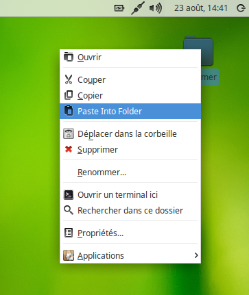 Among others, that expression has recently been translated ... https://git.xfce.org/xfce/xfdesktop/tree/po/fr.po#n756 #: ../src/xfdesktop-file-icon-manager.c:1759 msgid "Paste Into Folder" msgstr "Coller dans le dossier" https://git.xfce.org/xfce/xfdesktop/log/po/fr.po https://git.xfce.org/xfce/xfdesktop/commit/po/fr.po?id=4fbebea ... therefore upgrade the Xfce's desktop manager as whole, or just a message catalog; $ wget https://git.xfce.org/xfce/xfdesktop/plain/po/fr.po $ msgfmt -c --statistics -o fr.gmo fr.po $ su -c "cp fr.gmo /usr/share/locale/fr/LC_MESSAGES/xfdesktop.mo" man 1 msgfmt (gettext)