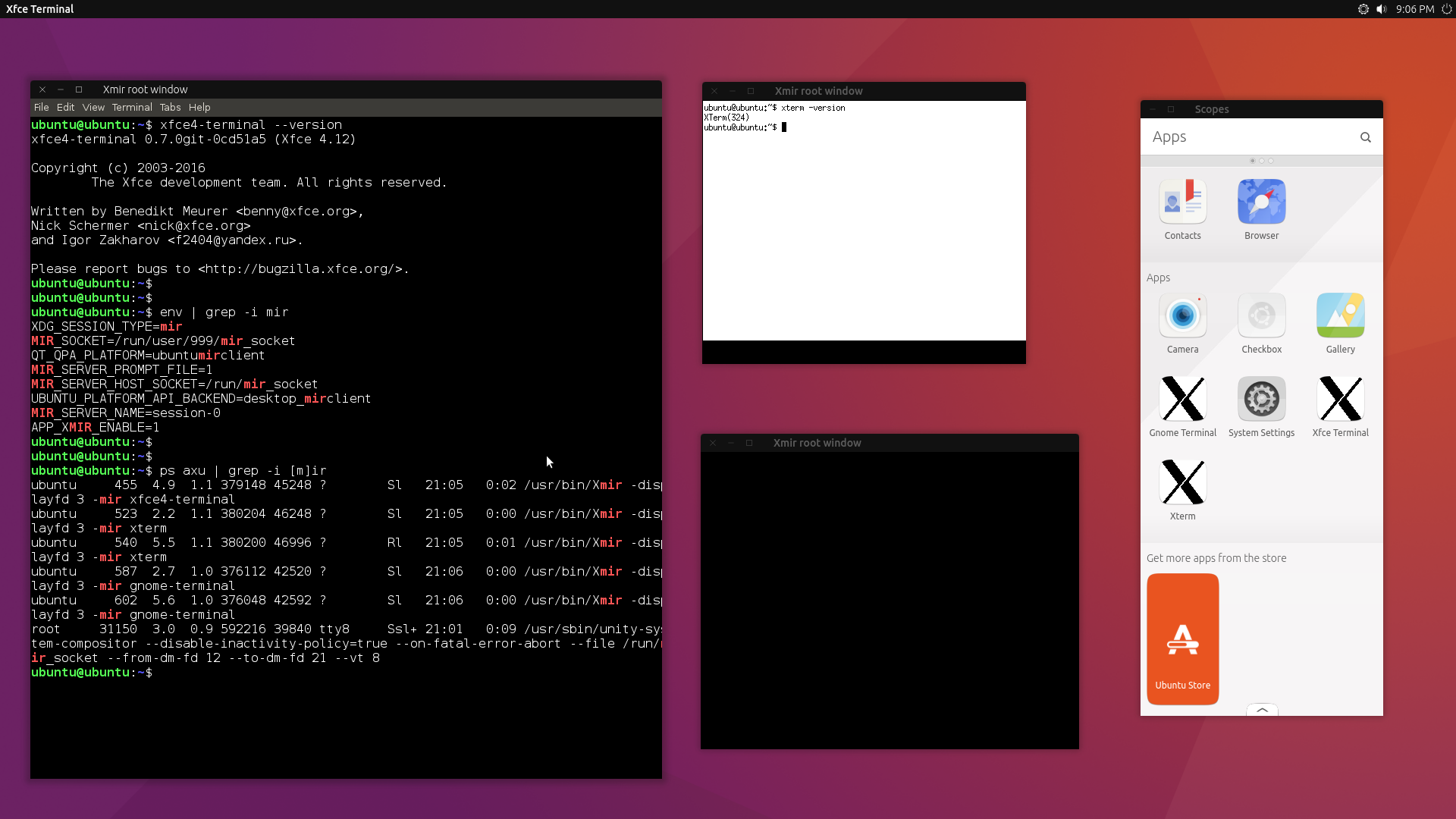 Created attachment 6792 Unity 8 Mir Desktop mode XMir Xfce Terminal Xfce Terminal via XMir on Unity 8 with Mir Desktop mode Tested with LiveDVD compilation: http://cdimage.ubuntu.com/daily-live/current/ yakkety-desktop-amd64.iso 2016-08-26 = How to = $ sudo add-apt-repository universe $ sudo apt-get update $ sudo apt install git xfce4-dev-tools libglib2.0-dev libgtk-3-dev \ libvte-2.91-dev libxfce4ui-2-dev \ unity8-desktop-session-mir xserver-xorg-xmir $ git clone git://git.xfce.org/apps/xfce4-terminal $ cd xfce4-terminal/ $ ./autogen.sh $ make $ sudo make install /home/ubuntu/.local/share/applications/xfce4-terminal.desktop [Desktop Entry] Name=Xfce Terminal Type=Application Terminal=false Icon=/usr/include/X11/bitmaps/xlogo64 X-Ubuntu-Touch=true X-Ubuntu-XMir-Enable=true Exec=xfce4-terminal