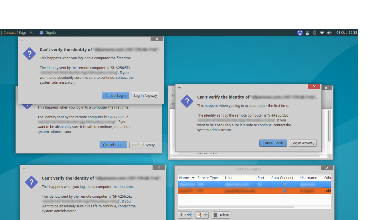 Created attachment 6869 Screenshot of Gigolo issue Adding hostname to Gigolo's bookmarks spawns multiple frozen key authentication windows. Reproducible: Always (at least with my server) Steps to reproduce: 1. $ ssh-keygen -R hostname 2. Open Gigolo 3. Create bookmark for hostname (SSH), check auto-connect 4. Wait a second... 5. Attempt to click [Log-in anyway] Expected behavior: Clicking Log-in anyway adds hostname's key to known_hosts