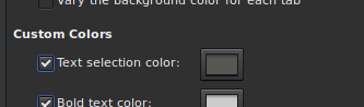 Created attachment 6908 Preferences dialog (Colors tab) Setting a custom color for "Text selection color" only allows setting the background color of selected text. Foreground will *always* be rendered completely black, forcing the user not to select a dark color for the selection. See attached screenshot image for details. Since this was possible in xfce4-terminal prior to switching to GTK3, I consider this a regression.