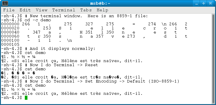 Created attachment 6994 Illustration of appearance of terminal window due to bug When using xfce4-terminal, I normally work in an environment with the ISO 8859-1 (Latin-1) character encoding and therefore have Preferences -> Advanced -> Encoding set to "Default (ISO-8859-1)". Until recently I was using Fedora 23 Linux with xfce4-terminal 0.6.3, but have recently changed to Fedora 25 with xfce4-terminal 0.8.4, or to be exact, Fedora RPM "xfce4-terminal-0.8.4-1.fc25.x86_64". Since this change, my character-encoding setting become broken if I ever reset the terminal -- either by the menu item "Terminal -> Reset" or "Terminal -> Clear Scrollback and Reset", or if an application sends the 2-character escape sequence "ESC c" to the terminal. Possibly the xfce4-terminal is now expecting UTF-8. Non-ASCII characters from a file of ISO 8859-1 text typically display as invalid-character blobs. If I do "Terminal -> Set Encoding ->" when the terminal is in this broken state, the setting "Default (ISO-8859-1)" is still marked as being set. However, if I actually select that item from the menu, then it clears the problem and restores the normal effect of my setting. I'll attach an illustration of the appearance.