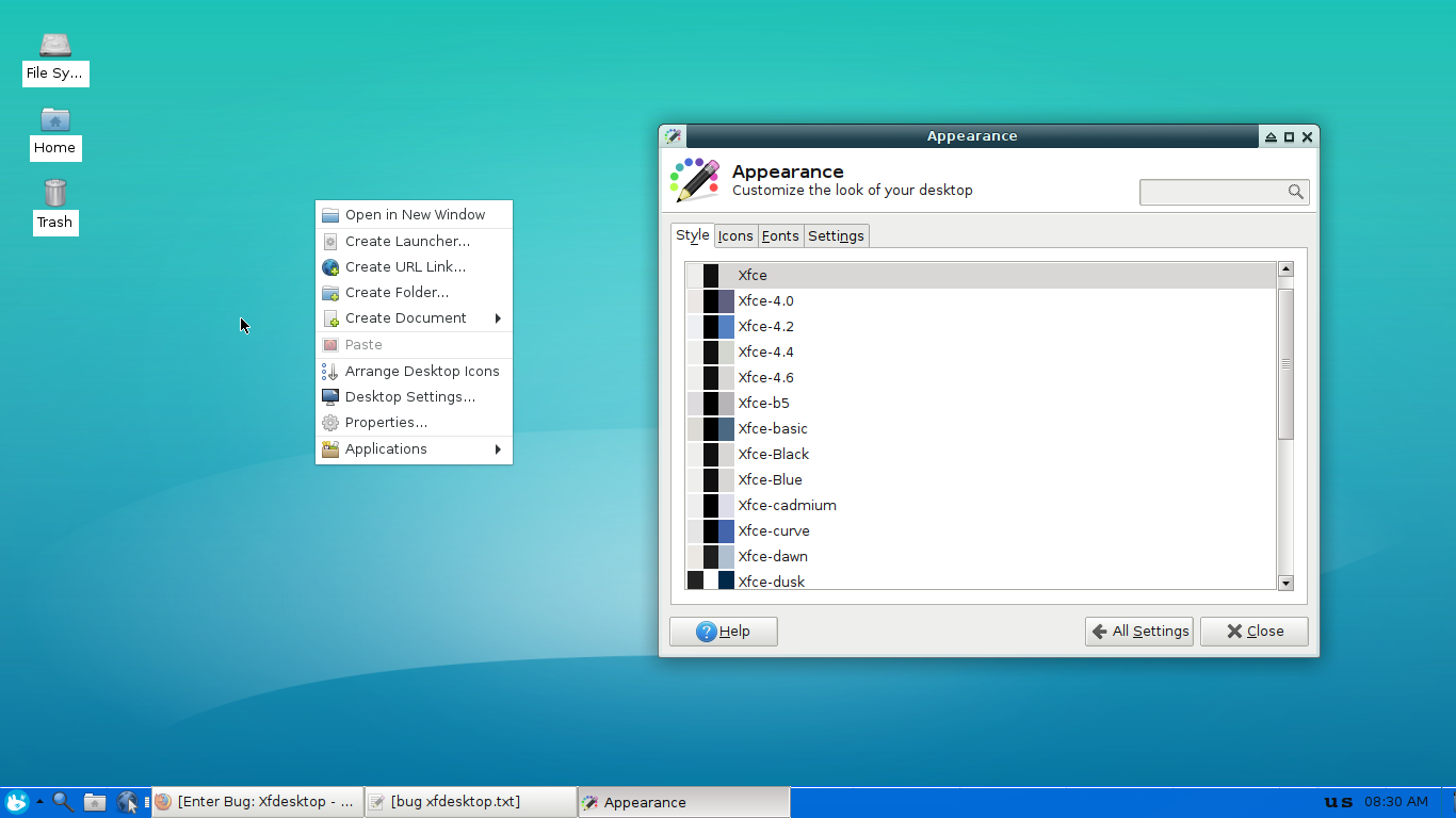 Created attachment 7102 xfdesktop-4.13.0 desktop icon text unmatch the gtkrc settings & theming Hello, I've interest to hunt some xfce4 bug from latest xfce 4.13.0 made I've found this bug. xfdesktop-4.12.3 still work fine but after I compile new package & install xfdesktop-4.13.0. The icon text become white & the text become black in all themes. All gtkrc settings that I've set inside gtk-engines-xfce and other gtk themes for xfce transparency are all gone not working with xfdesktop-4.13.0 Even open terminal here missing from the desktop right-click context menu.