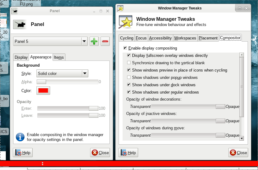 Created attachment 7211 Screenshot of panel demonstrating problem This was working previously. but has recently changed. xorg-server 1.19.3-2 xfce4-panel 4.12.1-1 NVIDIA GLX Module 381.22 [2017-06-30 06:15] [ALPM] upgraded nvidia-ck-sandybridge (1:381.22-3 -> 1:381.22-4) nVidia GP107 [GeForce GTX 1050 Ti] Could it be the Compositor? compton 0.1_beta2.5-8 ( Build Date: Fri 16 Jun 2017 11:12:56 AM PDT) command: qcompton -b --config /home/ljohnson/.config/compton/compton:0.0.conf -d :0.0