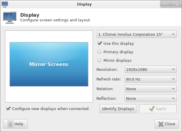 I'm seeing this with: Xubuntu 17.10 Dell XPS 13 9360 DE laptop Intel HD 620 GPU LG 27UD58P-B External monitor connected via Thunderbolt 3 to Display Port cable Whenever my system suspends or monitor happens to sleep, stand-by, whatever, my settings are not saved, mirror mode is enabled despite the fact that it was disabled previously, the checkbox claims it is disabled, and I am forced to reconfigure everything once again. I must check and then uncheck the mirror mode checkbox to get it to display both monitors again and then reconfigure my settings. xfce4-settings: 4.12.1-1ubuntu1 Linux kernel: 4.13.0-11-generic #12-Ubuntu SMP Tue Sep 12 16:03:57 UTC 2017 x86_64 x86_64 x86_64 GNU/Linux