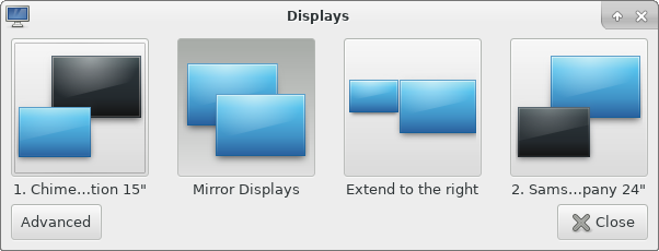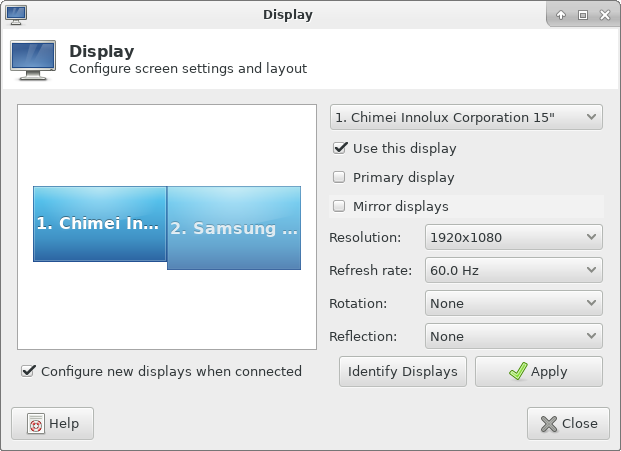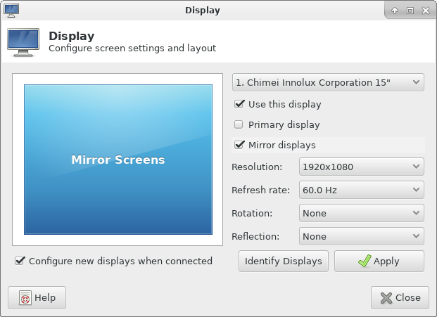 Created attachment 7226 xfce4-display-settings showing Mirror on the preview but no Mirror checkbox checked The default external display behaviour after pluging new device was "blank on the external display" until one decided to use "Extend to right" (preferred) or "Mirror". After upgrading to Fedora 26 (XFCE 4.12) the default display settings changed. After external display plugs in, it: - starts the half-assed Mirror mode - sometimes moves the main panel to the external display (which is not what the mirror mode does too) so it seems more like an error than intention - minimal settings (the xfce4-display-settings -m) indicates the Mirror mode - full settings (xfce4-display-settings) shows not Mirror mode checkox checked but shows Mirror mode on screen preview When I manually select "Extend to right" in minimal mode it just starts working in extend mode. When I play with other modes in minimal settings mode it mainly gets mad selecting wrong resolution for primary display. The right behaviour is to show the settings but do not mirror the display, at least not that strange way it does now.