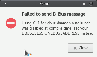 Created attachment 7293 An error message as described in the bug report. Hello, TL;DR: I was trying to refresh genmon on xfce-panel running on my user using root and failed with a non explanatory error message, I'm trying to do this so I can refresh genmon display using udev. Long version: First I would like to present my goal, I'm a Manjaro user: I want to have a genmon item showing me the current battery status for my phone connecting via USB cable with adb (debug mode enabled). I configured my genmon correctly, I even have error handling mechanism for when my device is being disconnected and the "adb shell" command would fail. And then I realized I want more, I want the genmon script to be refreshed when I'm plugging or unplugging my device so I wrote a simple udev script, I think now is the right time to mention that the udev scripts are running as the "root" user. So I tried refreshing my genmon display using this command: /usr/bin/xfce4-panel --plugin-event=genmon-10:refresh:bool:true But it didn't work. So I tried switching to root and then running this command again to simulate the udev environment, the command failed due to missing display so I added --display=:0. Now I got a "protocol undefined" so I switched to my user with su so the command looks something like: su yaron -c "/usr/bin/xfce4-panel --plugin-event=genmon-10:refresh:bool:true --display=:0" Now I'm getting a dialog with the following details: Title: Failed to send D-Bus message Message body: Using X11 for dbus-daemon autolaunch was disabled at compile time, set your DBUS_SESSION_BUS_ADDRESS instead (Screenshot attached). I Googled the issue and on some bug reports devs were saying this is a really old version so I tried looking at the version myself. So apparently I'm using the latest version: xfce4-panel 4.12.1 (Xfce 4.12) Copyright (c) 2004-2011 The Xfce development team. All rights reserved. Please report bugs to <http://bugzilla.xfce.org/>. If I'm doing something wrong please tell me, if there's something I can fix myself I'd love that.