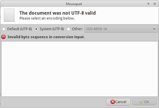 Created attachment 7383 Screenshot When opening a file that isn't UTF-8 valid, a window pops up (see attached screenshot). Selecting 'Other: ISO-8859-14' always works and the file can be opened. However, doing this always causes Word Wrap to be disabled. How to reproduce: 1. Ensure Word Wrap is enabled. 2. Open a non-UTF-8 valid text file. 3. Select 'ISO-8859-14' and open the file. 4. Word Wrap will now be disabled.