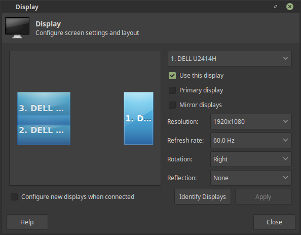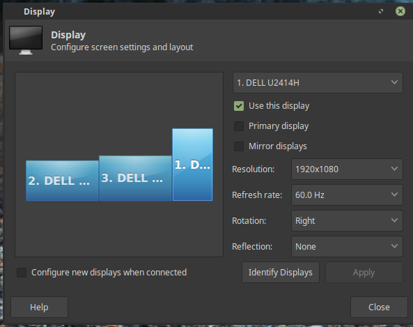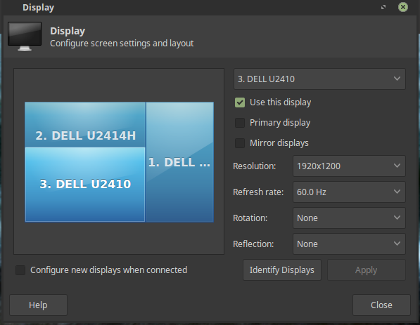 Created attachment 7417 normal display config Hi, please forgive me if this report is in the wrong section. I didnt really know where to place it but this one looked the most likely. I have 3 monitors of different sizes next to each other, with the middle monitor being my primary monitor. See attached `Selection_011.png`. When either the most left monitor or the middle/primary monitor switches off, the desktop is resized to the 2 remaining monitors. But if I switch the monitor on again, it is assumed that the primary monitor is always on x position 0 causing the desktop to overlap. See `Selection_010.png` for when I switch off/on the middle/primary monitor and `Selection_012.png` for when I switch off/on the left monitor. Although I am happy to spent some time writing a patch for this, I have no idea where to start looking unfortunately. The screenshots were made with the latest git version of xfwm4.
