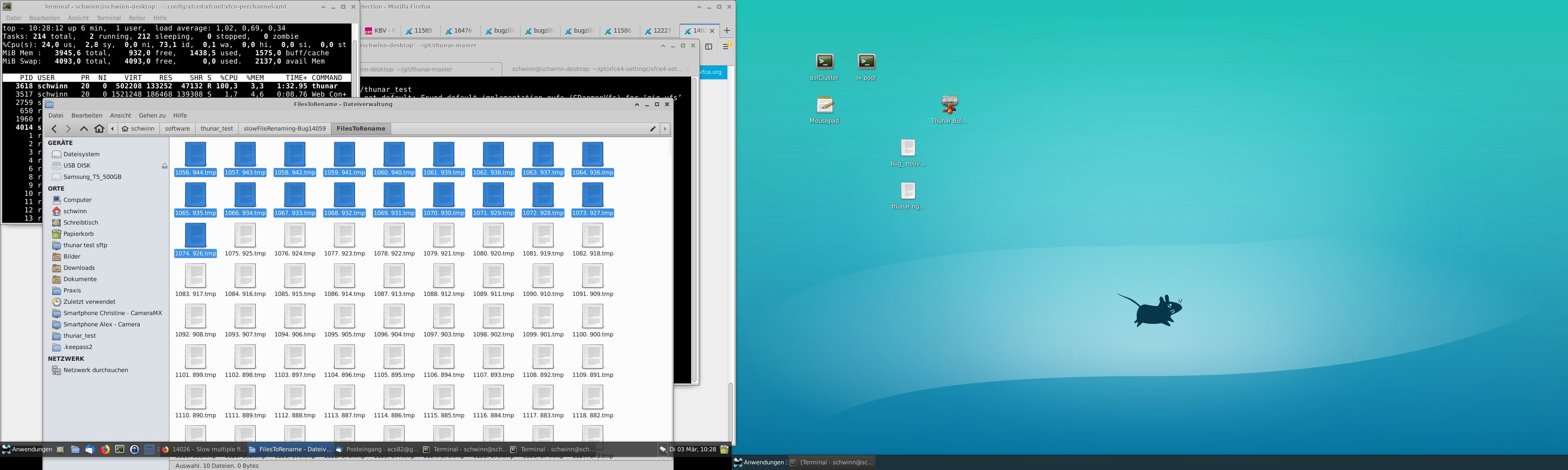If you are brave, you could try to compile thunar from source ( you as well will need to compile exo from source ) ... you can get the code of both from here: https://git.xfce.org/ Thunar master ( and thunar 1.7 ) are using gtk3 instead of gtk2 .. however I would bet that the gtk version does not make a difference for the bug. For the first factor ( weak performance ) , the class "Thunar-abstract-icon-view" probably is the right places to search. "Thunar-abstract-icon-view" is the parent class of "Thunar-compact-view" and "Thunar-icon-view" which both are affected.