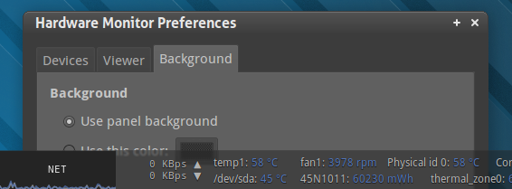 Created attachment 7474 xfce4-hardware-monitor-plugin compared to other plugins that do support transparency Neither of the current options allow for the viewer to have a transparent background. Setting it to "Use panel background" does make it pick a color from the panel, but it's just that: a fully-opaque color. If the viewer is set to use the panel background, it makes sense that it would match whatever the panel is set to, be it image, color and/or transparency. A transparent background on the graphs would allow the panel to be uniformly semi-transparent throughout, and also let users design their own borders/backgrounds using the background image setting already built into the panel. I'm not sure if transparency is possible with the systems being used, but as far as I can tell there are a few possible ways to go about this if it is: 1. Allow the user to set a semi-transparent background color (user could set opacity to zero) (possibly re-string "use panel background" to clarify that it only picks a color) 2. Change "use panel background" to be transparent and let the panel image through 3. Add a "transparent" option