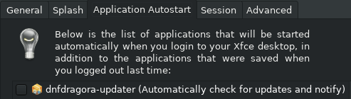 Created attachment 7513 dnfdragora-updater unchecked. Even in the case where the application dnfdragora-updater is unchecked in Session and Startup (attachment) in addition to the previous case, one icon is still displayed after logout or reboot. Steps to Reproduce: Uncheck dnfdragora-updater then reboot.