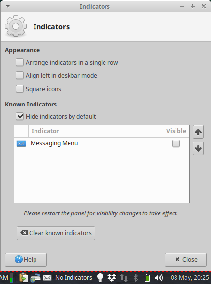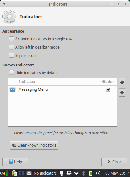 Created attachment 7720 Xfce Indicator Plugin settings 1. Rightmost envelope is from indicator plugin I have added Mail Watcher(xfce4-mailwatch-plugin) plugin to the panel which sits there, scans for new mail every 10 minutes, shows notification on new mail arrival and launch my desired mail client (Though I've to admit setting it up properly requires a bit pre-acquired knowledge and effort, so not new-user friendly). So, as I've already got this working mail notifier+launcher(xfce4-mailwatch-plugin) on my panel, I don't need another big confusing envelope icon from Mail Reader which is just a launcher for the default mail client. The Mail Reader (exo-open --launch MailReader %u) is an integral part of the desktop environment and removing it also removes the whole desktop and the file manager. It shows it's icon using xfce4-indicator-plugin and there is an option to hide this(or any) icon in Indicator Plugin settings. But when I select the hide option and reboot, the Mail Reader icon disappears but a large space occupying, useless text "No indicator icon" appears on the panel. Which actually hampers the main usefulness of icon hiding feature. Please change this. OS: Ubuntu 18.04 DE: Xfce 4.12(Xubuntu) Related package: xfce4-indicator-plugin 2.3.4-0ubuntu1 Proposed fix: When user hides all icons from Indicator Plugin, no text should appear on it's place on the panel.