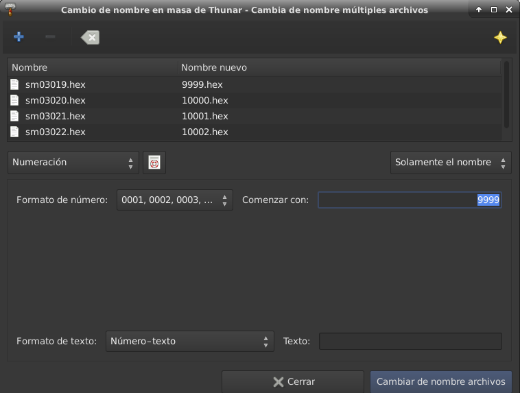 Hi Alex and thanks for your reply, I work with a large number of files, each of these files contains the results of analysis of a laboratory sample. The sample numbers are like a name never repeated and the files grow over the years. Currently, we are registering samples above the 12000 number. When I receive, for example, 50 files of an instrument and I have to rename them in a massive way to assign a sample number to each one of them. For this reason I came across this limitation. For example: IE_TX_12245.csv IE_TX_12246.csv IE_TX_12247.csv IE_TX_12248.csv IE_TX_12249.csv IE_TX_12250.csv ..... It is very rare that someone has to rename more than 10,000 files at once, but I think it is not so strange that the name of these files is above four digits. I have solved the problem by adding the thousands digits to the text field, I attach a screenshot so you can see the result. At first when I wrote this BUG, I did not see this possibility, and I thought about adapting the code so that the numerical value entered in "start with" is added to the current four-digit counter, but now I do not know if it is interesting to make changes in the code I do not know if you understand me because my English is very poor Thanks for your time
